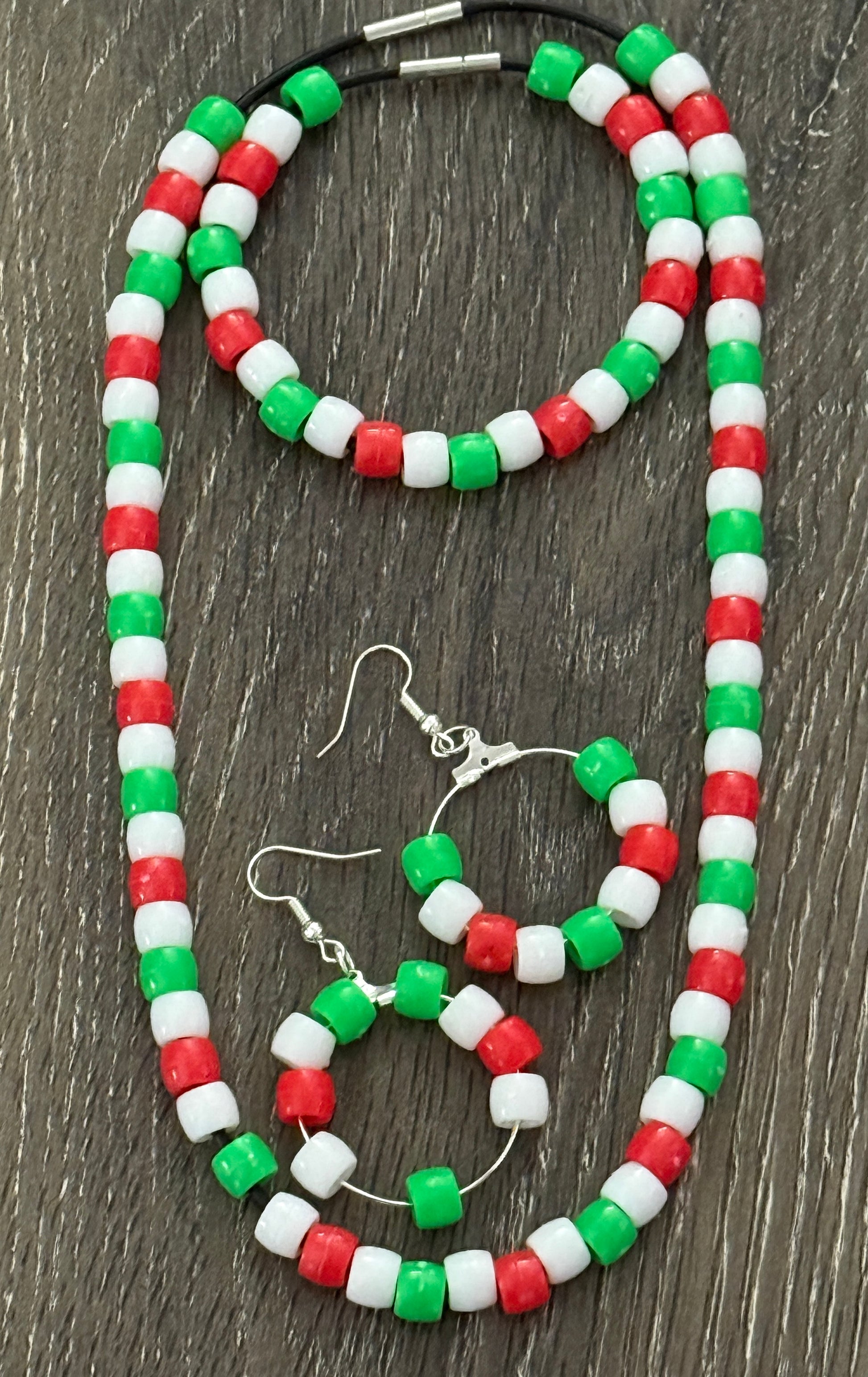 This Beaded Necklace, Bracelet and Earrings set is crafted with vibrant and colorful pony beads to add a pop of color to any outfit. Made with quality materials, this set is both eye-catching and durable. Perfect for adding a touch of style to your wardrobe.