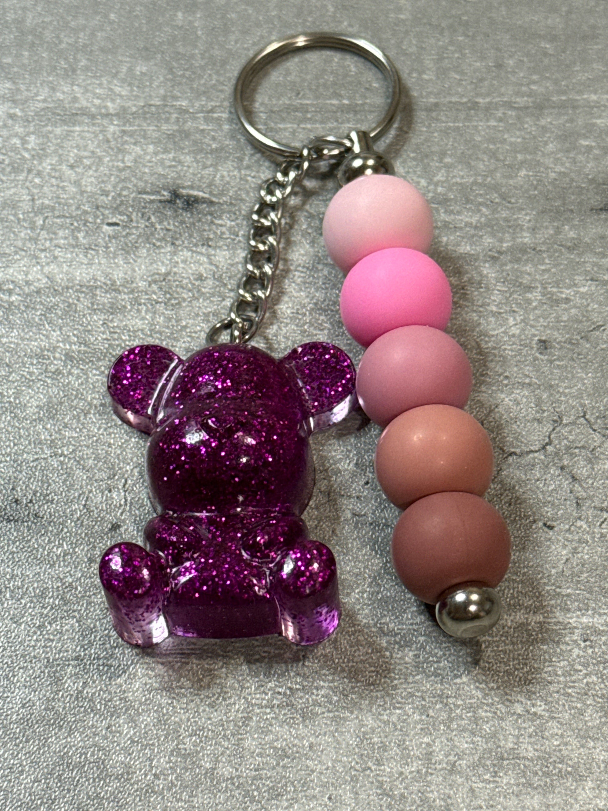 This durable and stylish keychain features silicone beads, a shiny silvery chain, and a glittery bear charm. Perfect for keeping track of your keys in a fun and fashionable way. The silicone beads add a comfortable texture while the glitter adds a touch of sparkle.