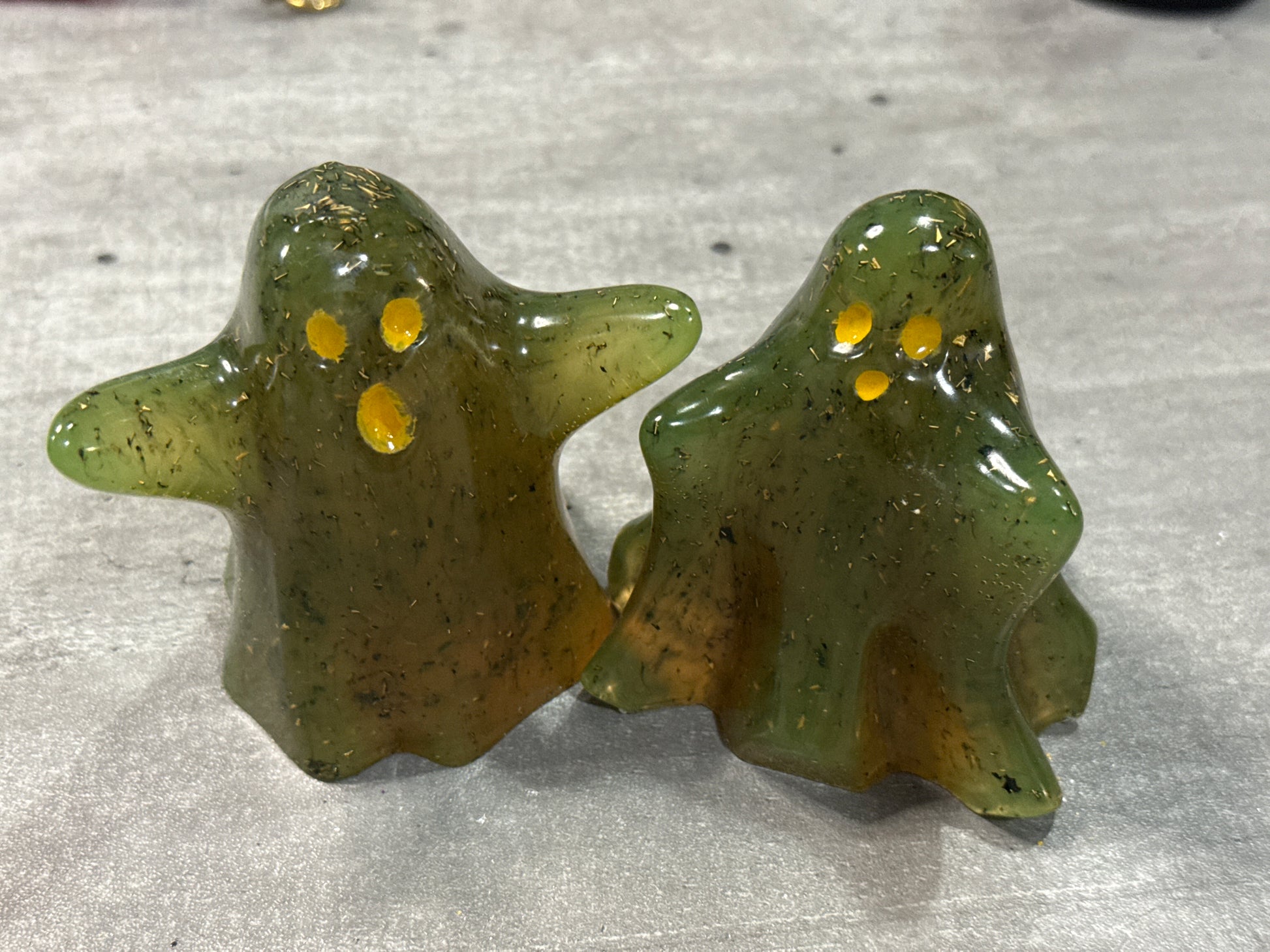 These ghosty friends are crafted with high-quality resin, foil flake or glitter, and mica powder for a stunning and spooky glow-in-the-dark effect. Perfect for Halloween parties or adding a touch of whimsy to any room. Give a unique and eerie touch to your decor with these one-of-a-kind ghosts.