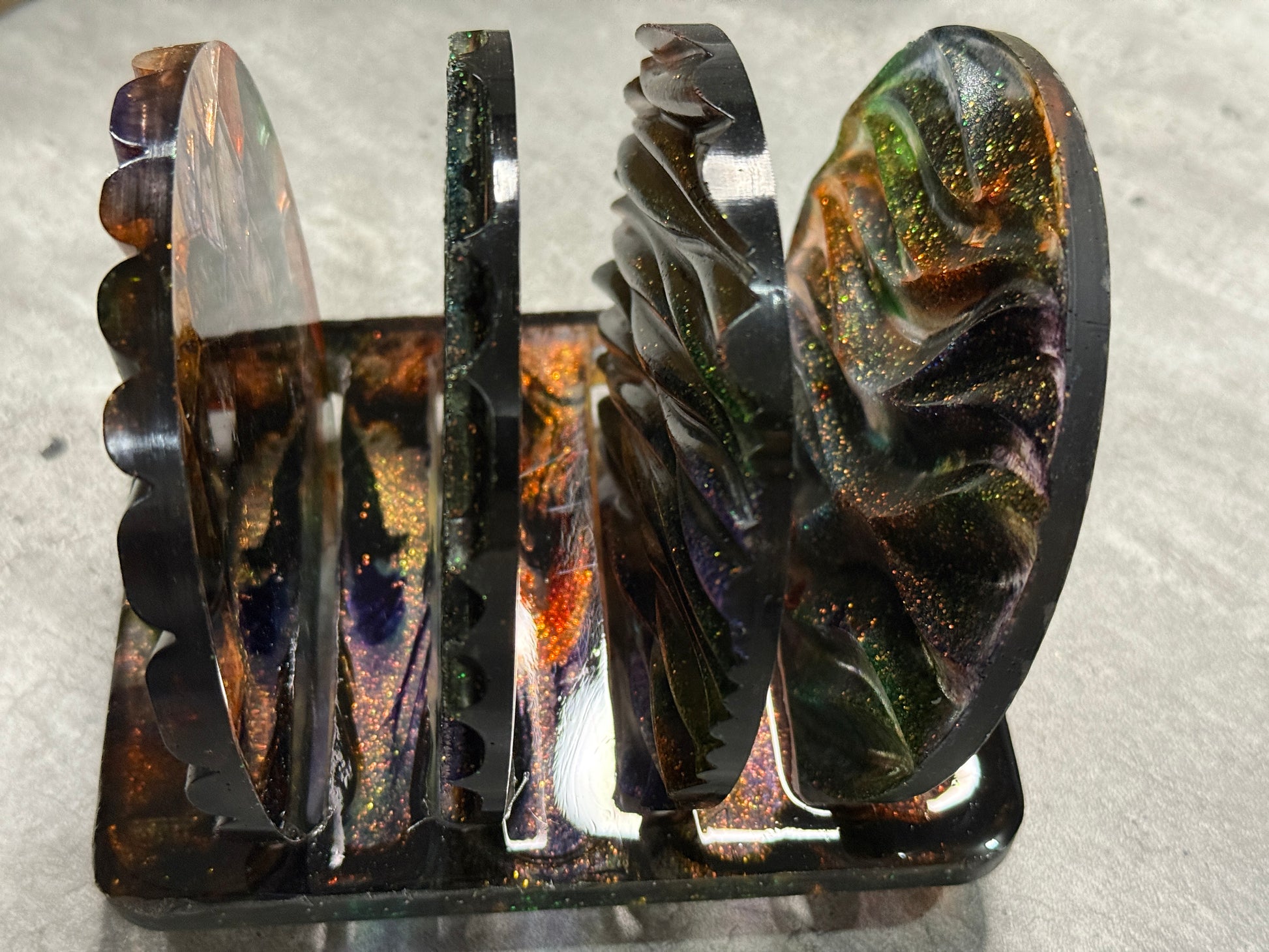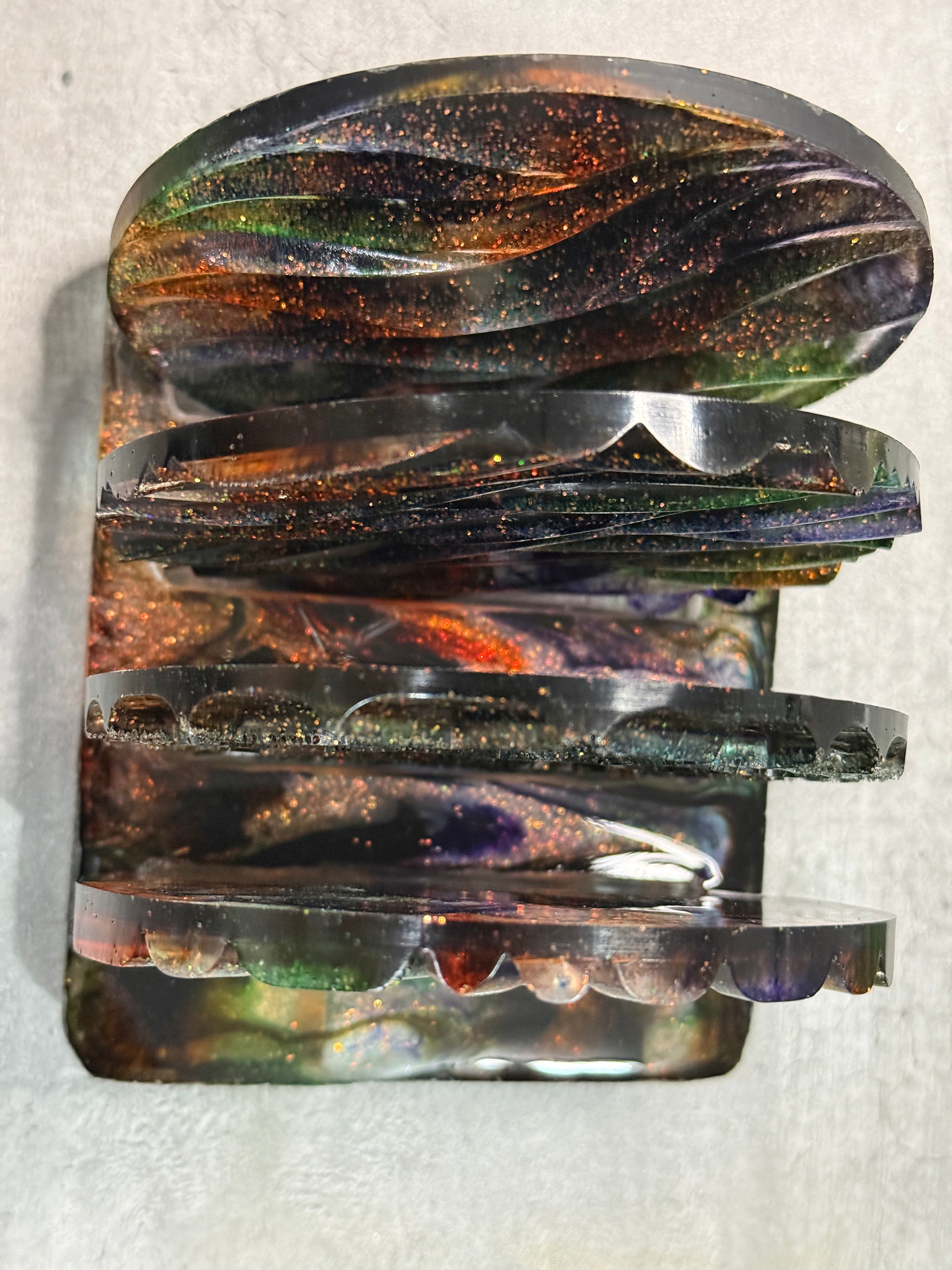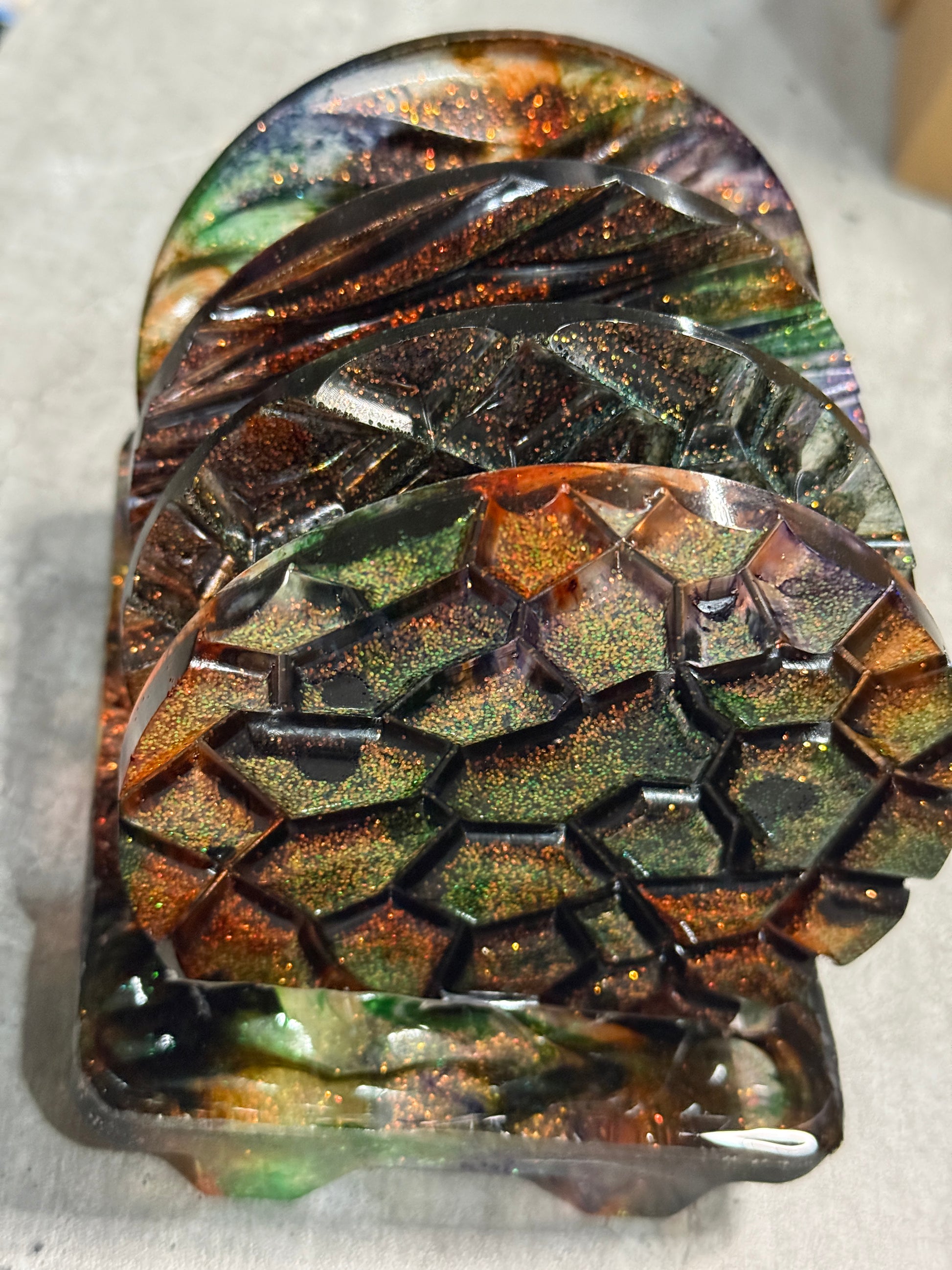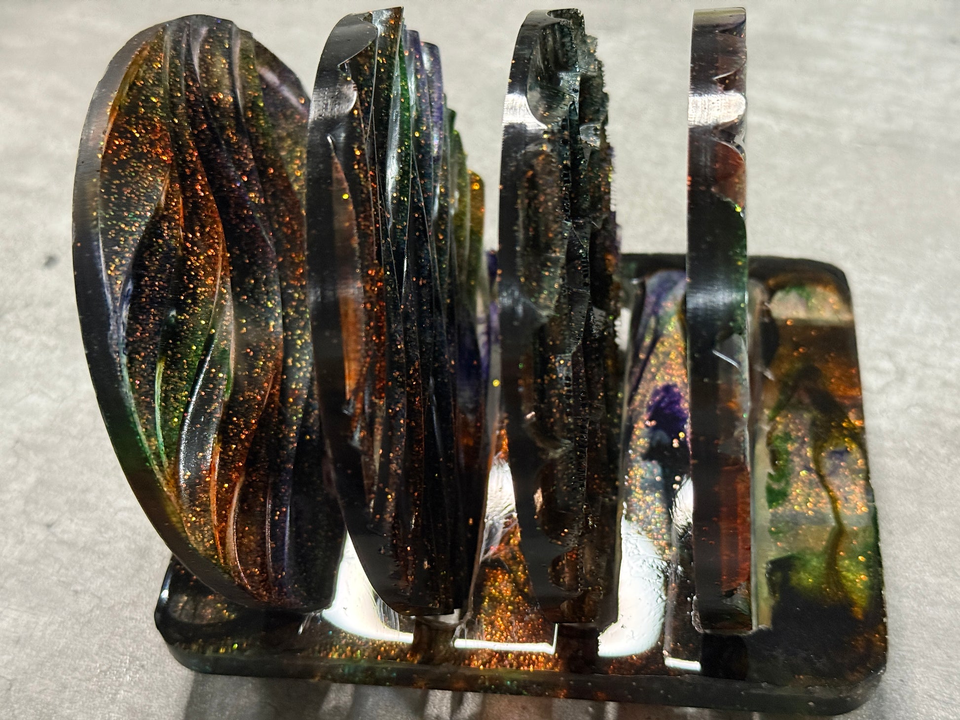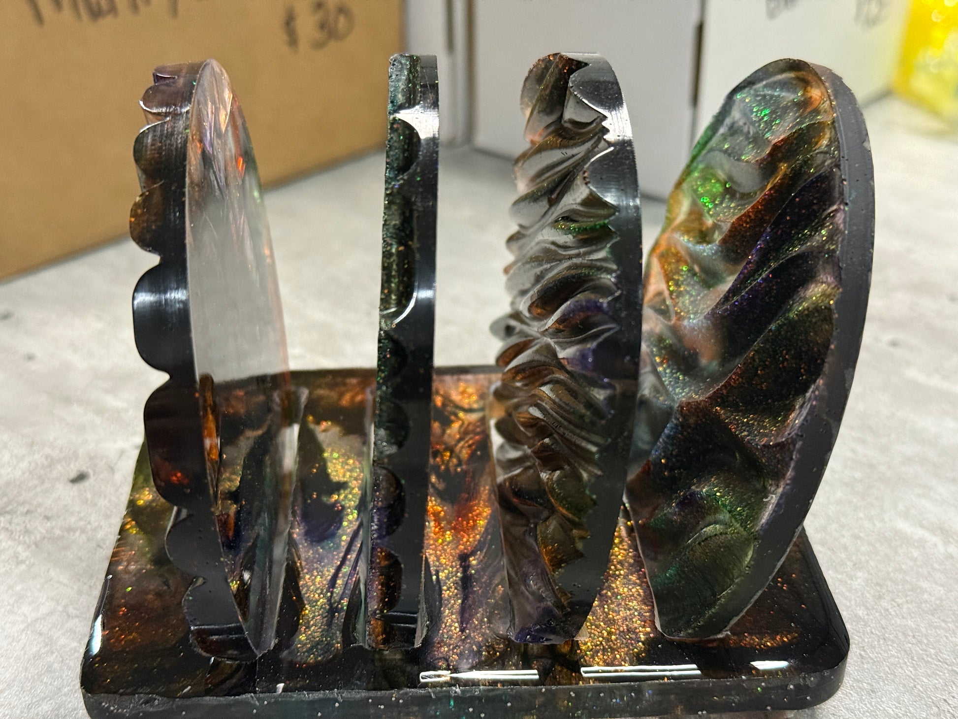 Enhance your Halloween decor with our spooky and sparkly coaster set. Made with durable resin, each coaster is uniquely designed with vibrant alcohol inks and a touch of glitter. Perfect for protecting your surfaces and adding a touch of frightful fun.