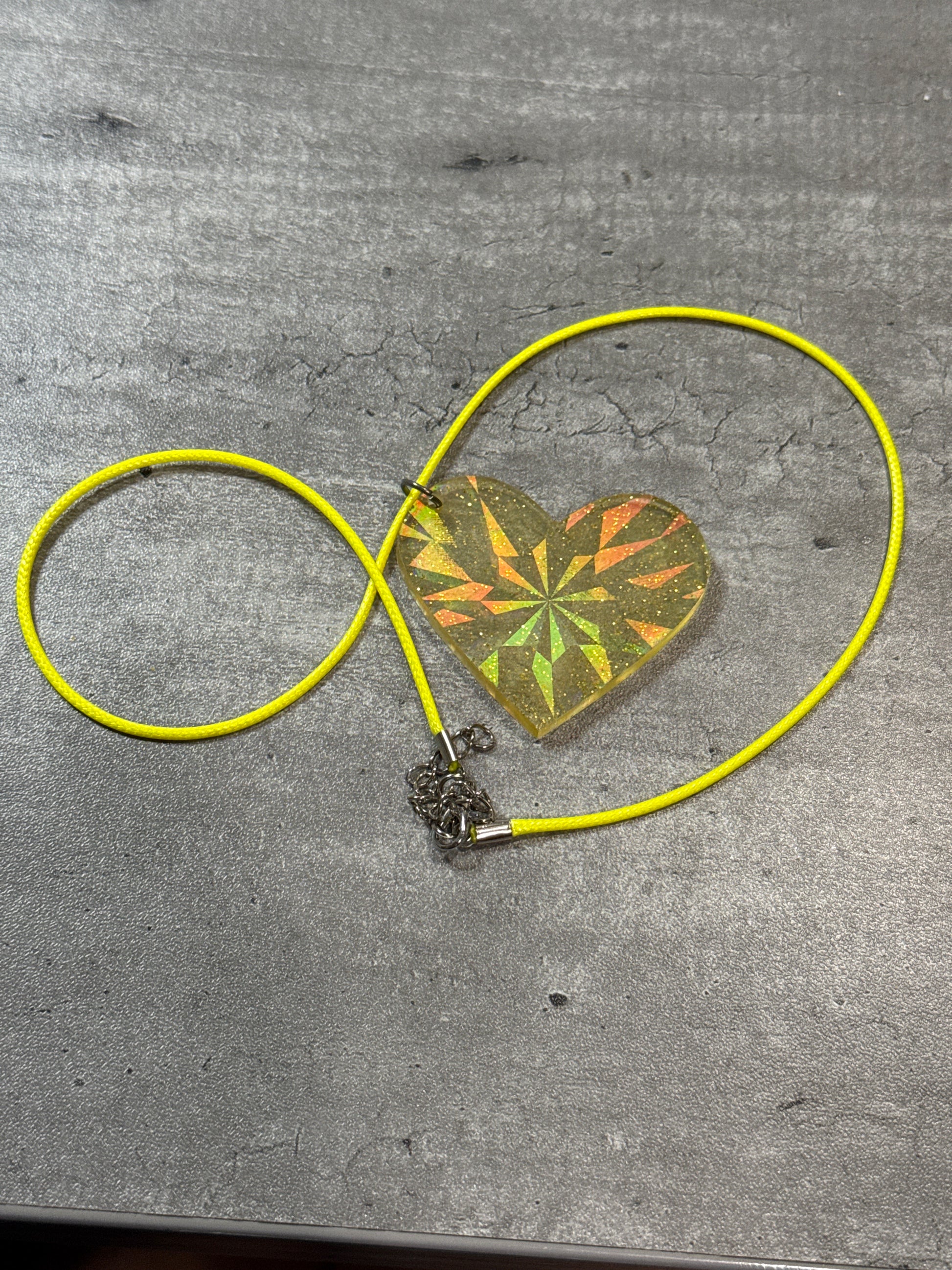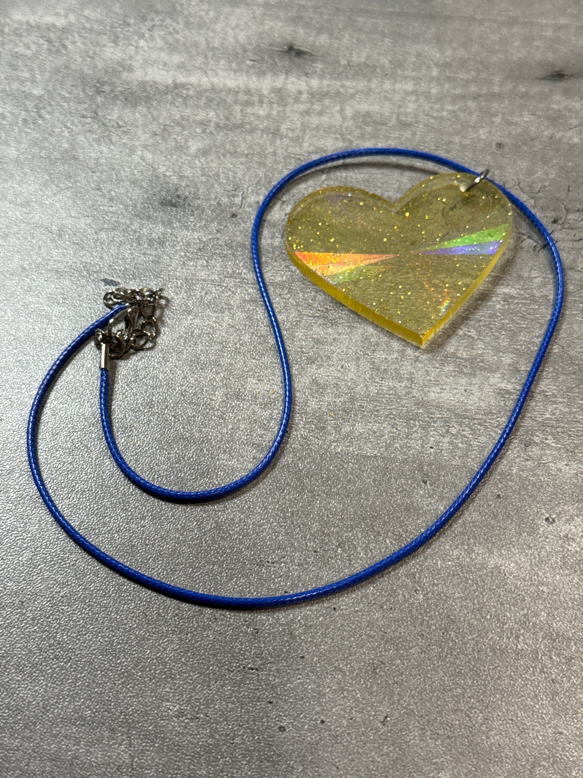 Expertly designed with vibrant resin, this Large Holographic Heart Pendant Necklace adds sparkle to any outfit. The 18” wax cord with 2” extender ensures a comfortable fit for all. Perfect for adding a touch of color and shine to your look.