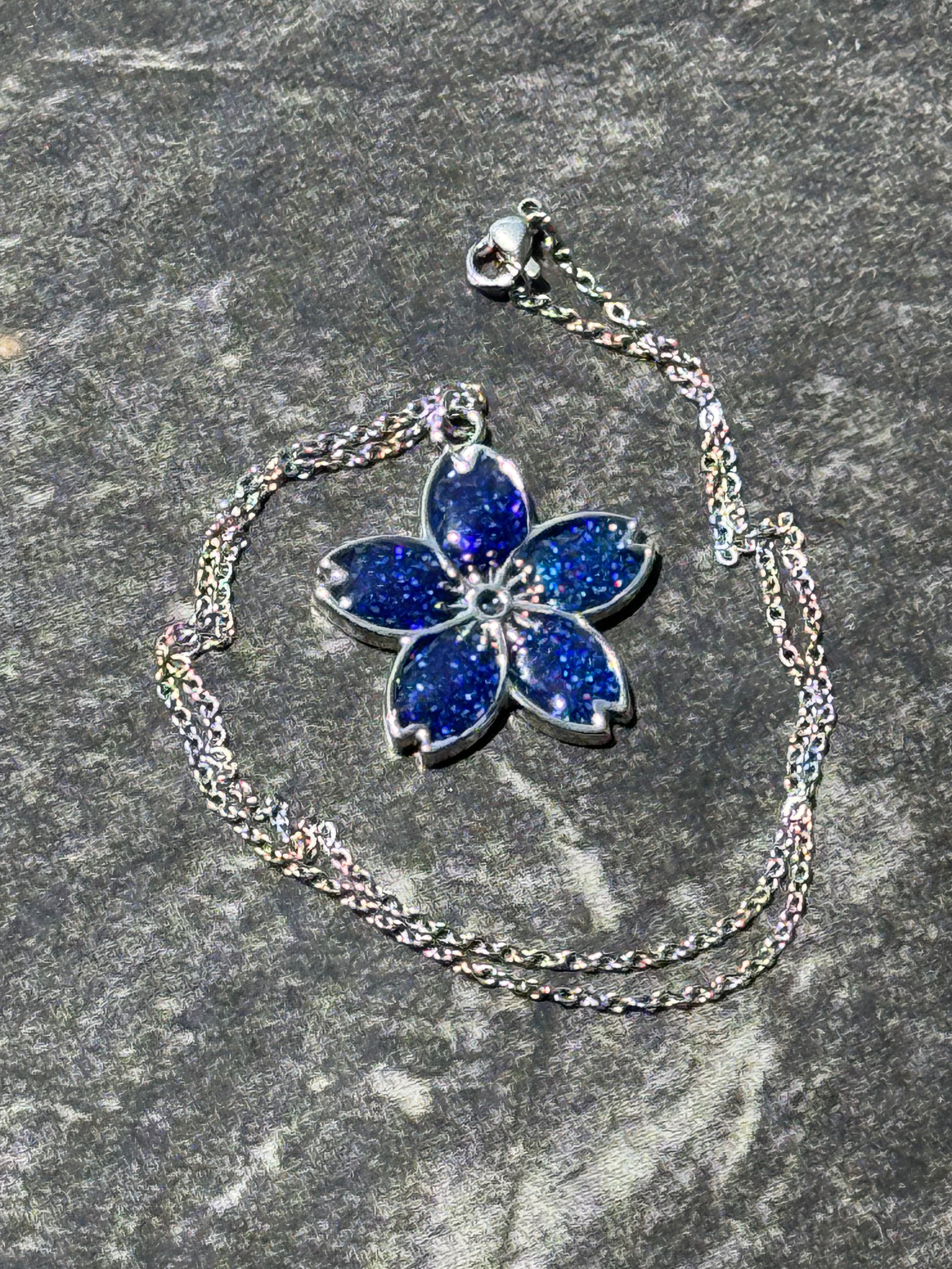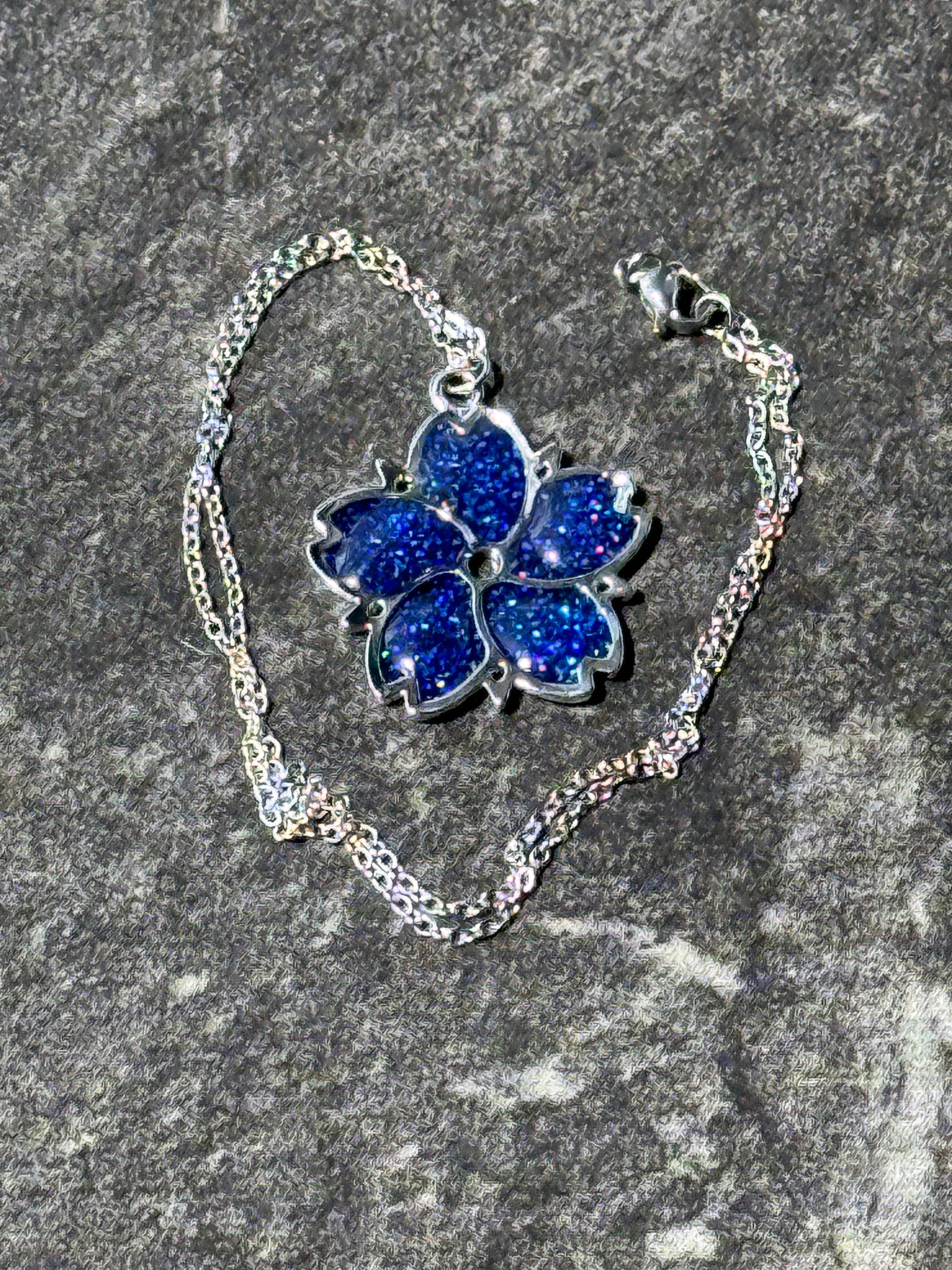 This Sakura Blossom Pendant Necklace features a stunning blend of UV resin, royal blue, silver, and sparkle, creating a unique and eye-catching piece of jewelry. The UV resin ensures long-lasting durability, while the delicate royal blue and silver hues add a touch of elegance. The chain is silvery. The subtle sparkle adds a touch of glamour to any outfit.