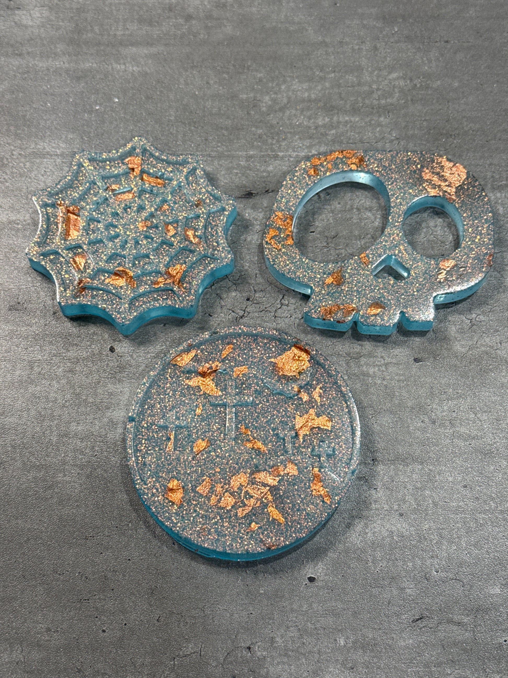 Enhance your Halloween decor with our spooky and sparkly coaster set. Made with durable resin, each coaster is uniquely designed with vibrant, glow-in-the-dark mica powders and a touch of glitter or foil flake. Perfect for protecting your surfaces and adding a touch of frightful fun.